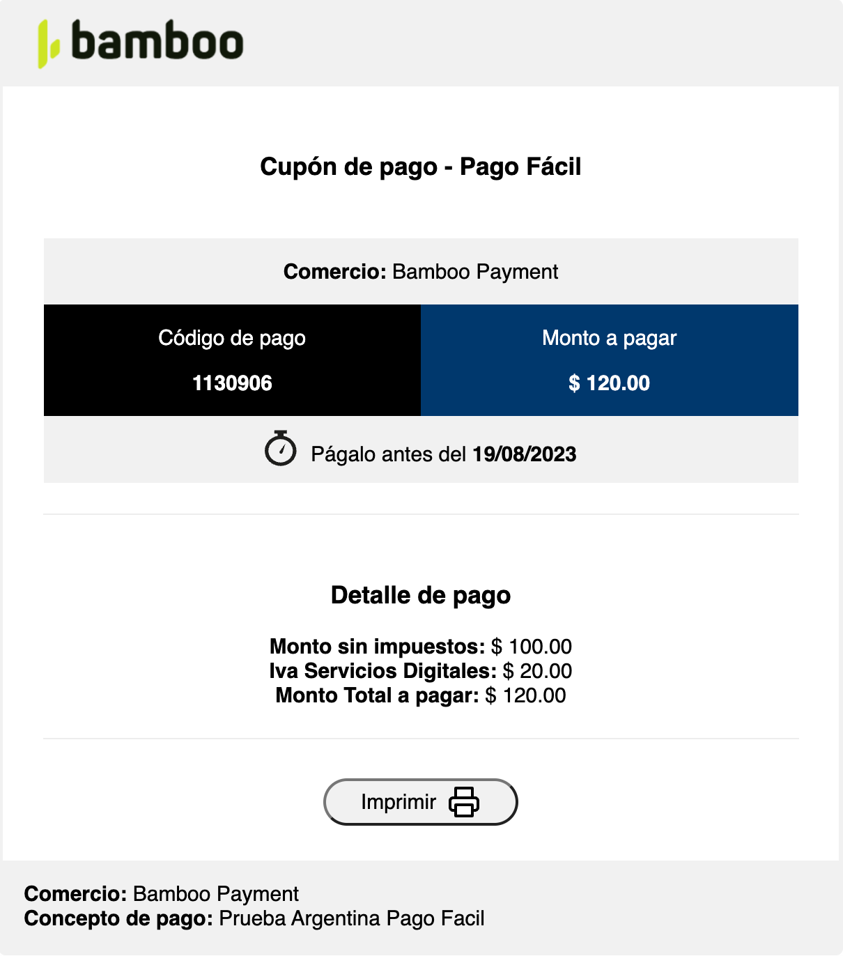 }Note: Redirect your customer to the URL in Action.URL, where they can view or print the voucher and complete the payment at a Pago Fácil location. Once the payment is completed, Bamboo automatically updates the transaction status via webhook.