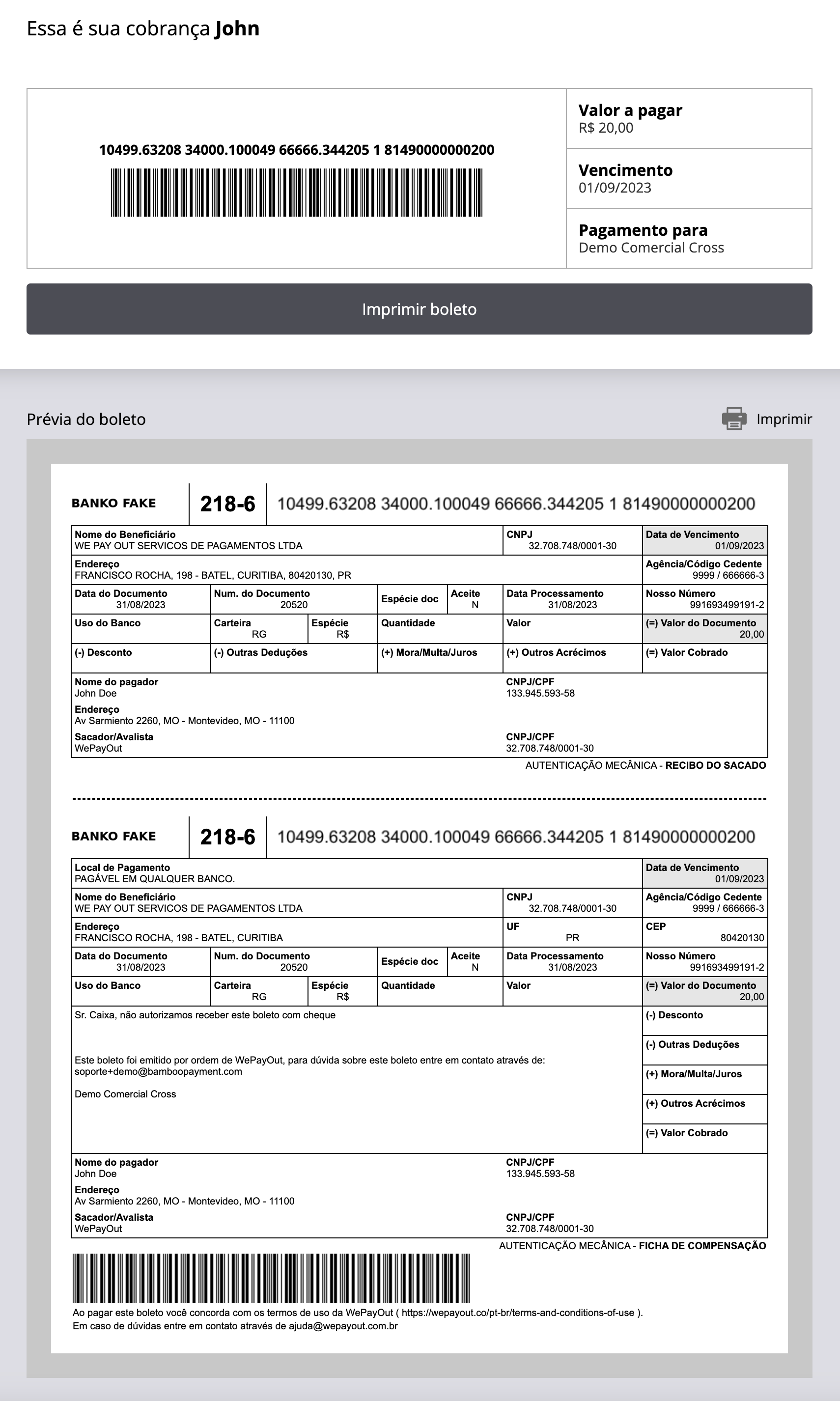 MetadataOut → PaymentBarCodeUrl | string | URL of the payment page. You can redirect the payer to this page to download the boleto. |