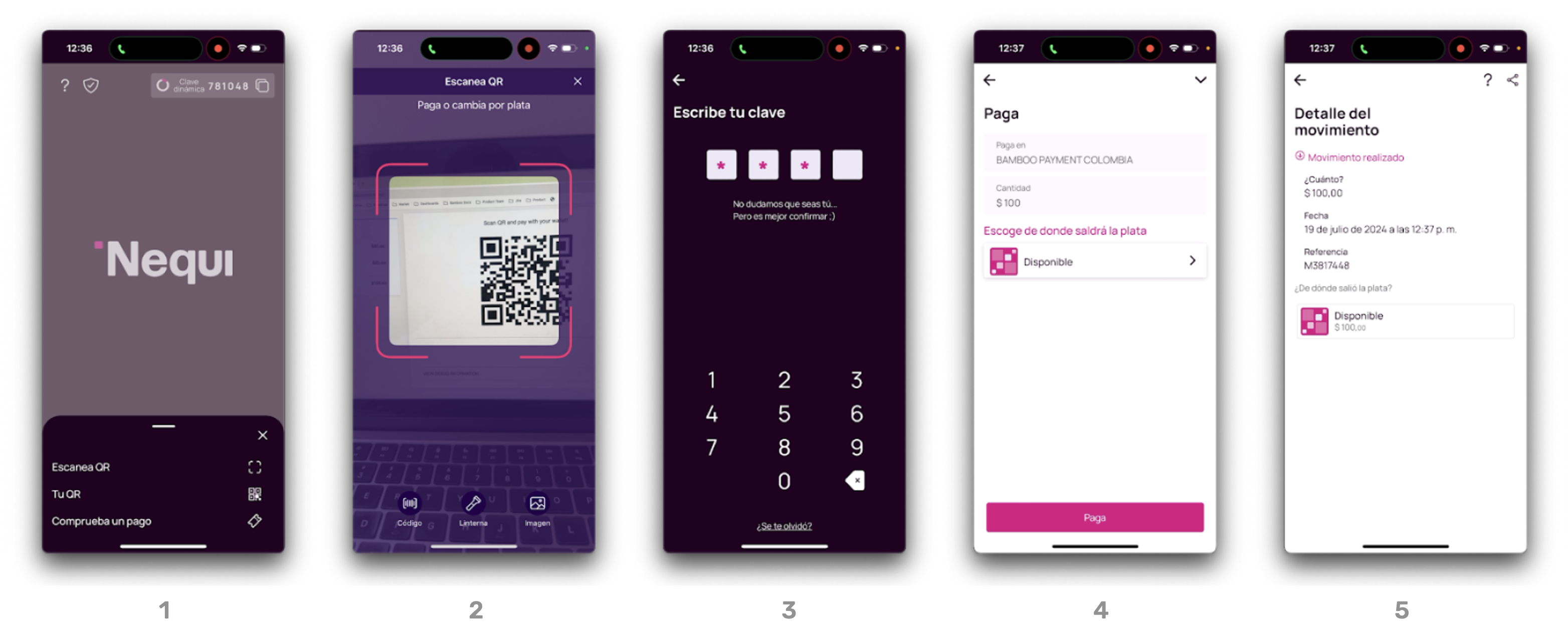 Bamboo supports two payment flows with Nequi in Colombia: QR and Push. Both methods allow immediate mobile payment initiation through the Nequi app.