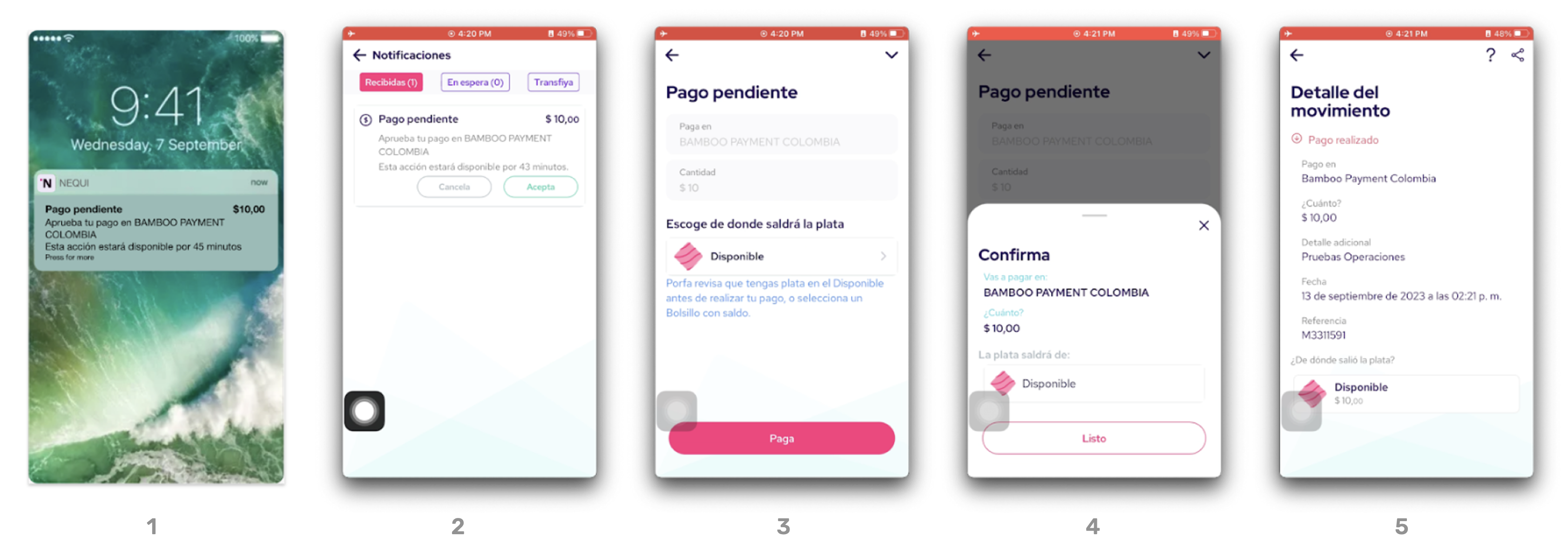 - The payer enters their phone number at checkout. Bamboo sends a payment request to Nequi, which triggers a push notification on the payer’s phone with the transaction details.