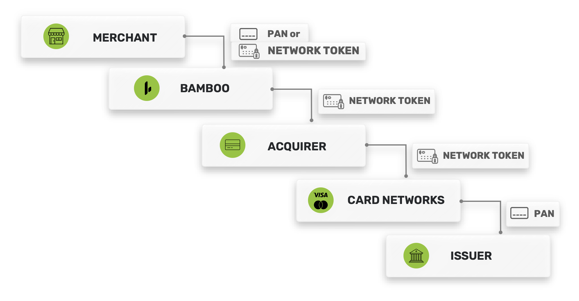 Bamboo supports the pass-through model, where merchants or wallets generate the network token and send it to Bamboo, which forwards it to the acquirer along with the required cryptographic information (Cryptogram).