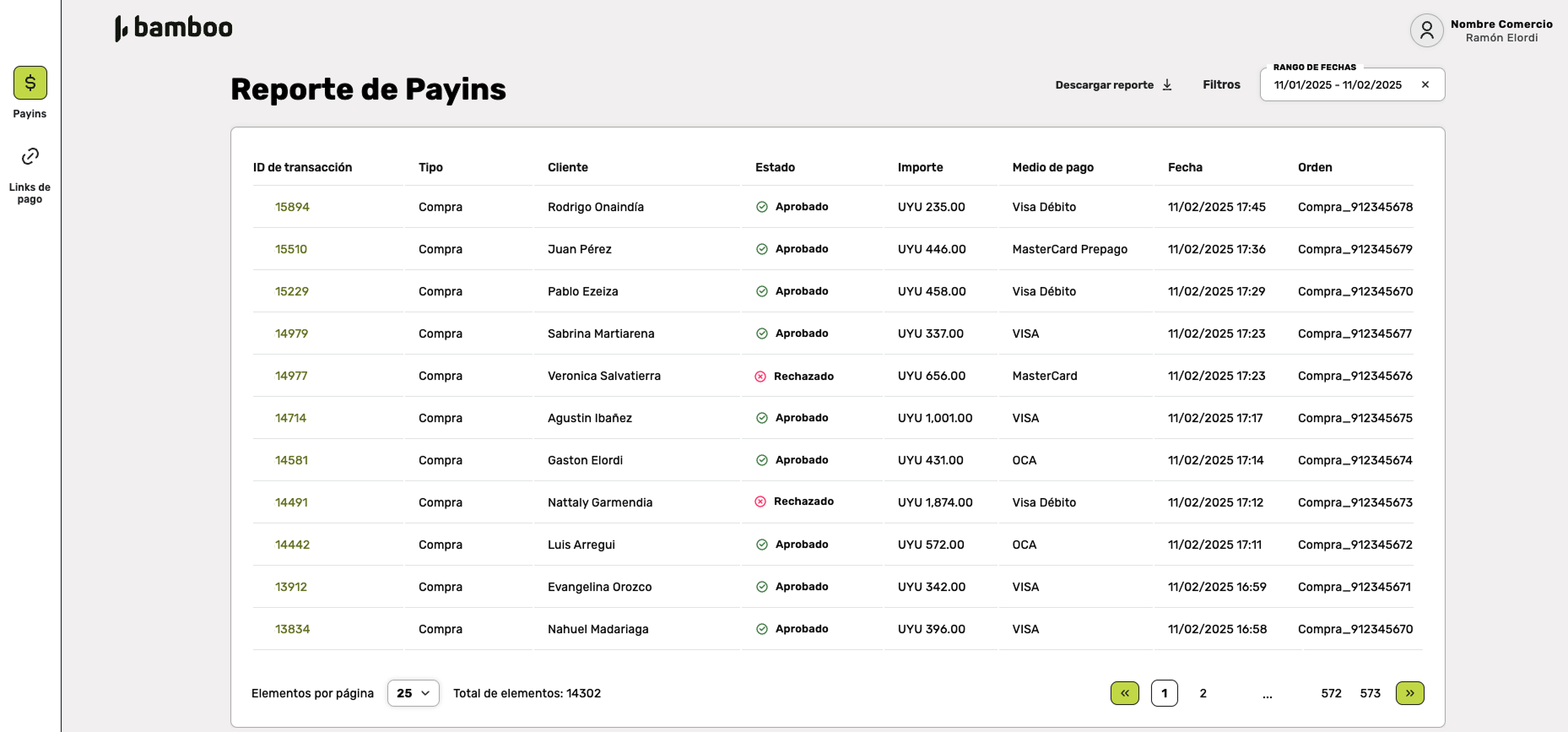 The Payin Report section allows users to view a detailed list of all transactions processed through Bamboo Payments. This view provides relevant information about each transaction, such as customer details, status, amount, payment method, and other useful information for management and analysis.