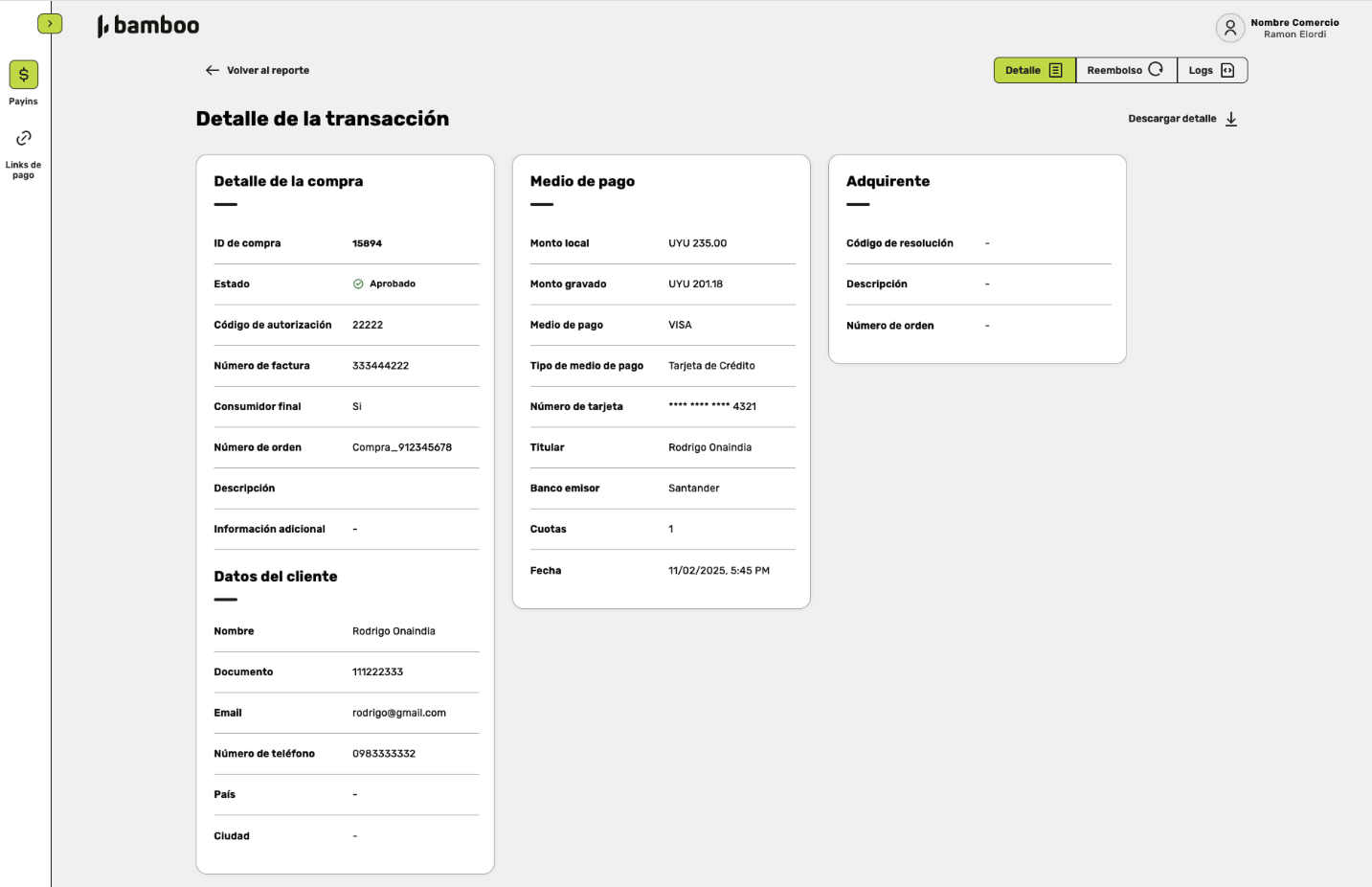 When selecting a transaction from the Payins list, you’ll access a detailed view that presents information organized in four main sections: