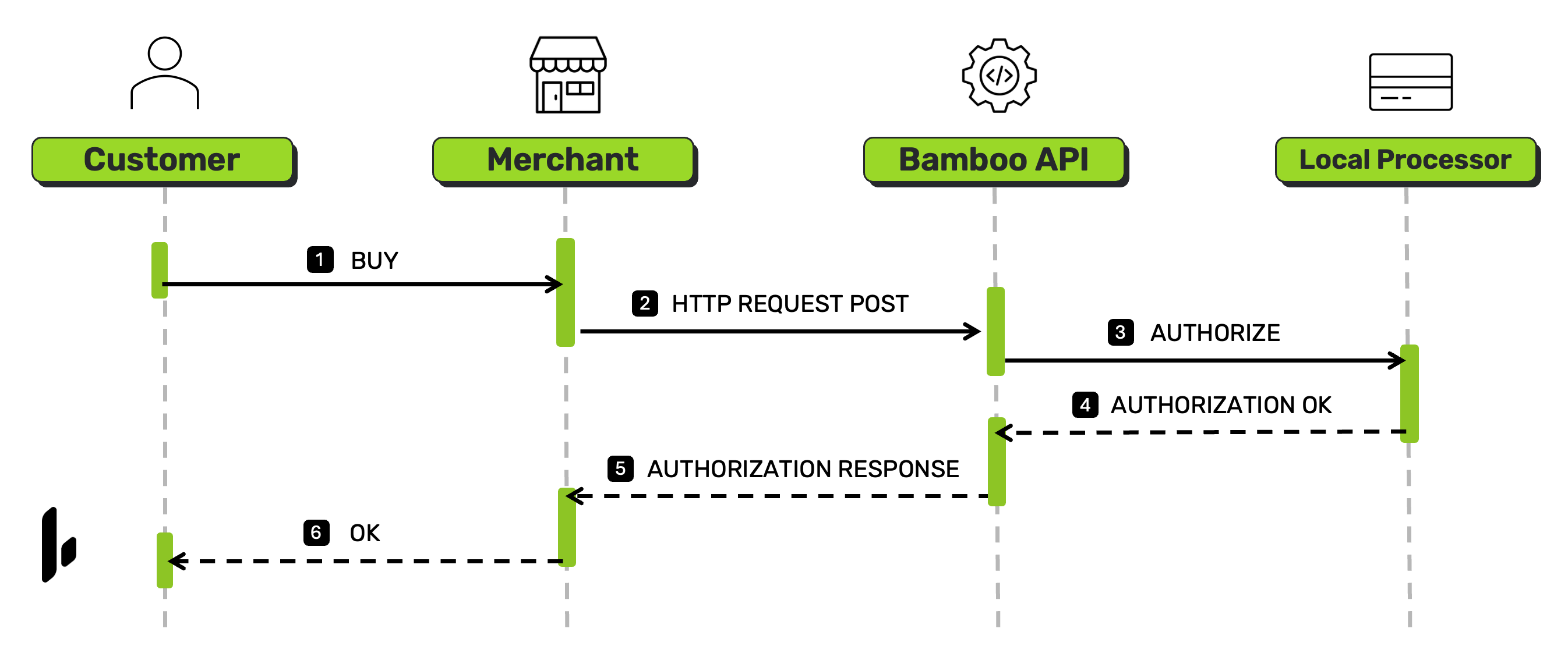 POST /api/Purchaserequest to Bamboo. - Authorize — Bamboo forwards the request to the acquirer for processing.