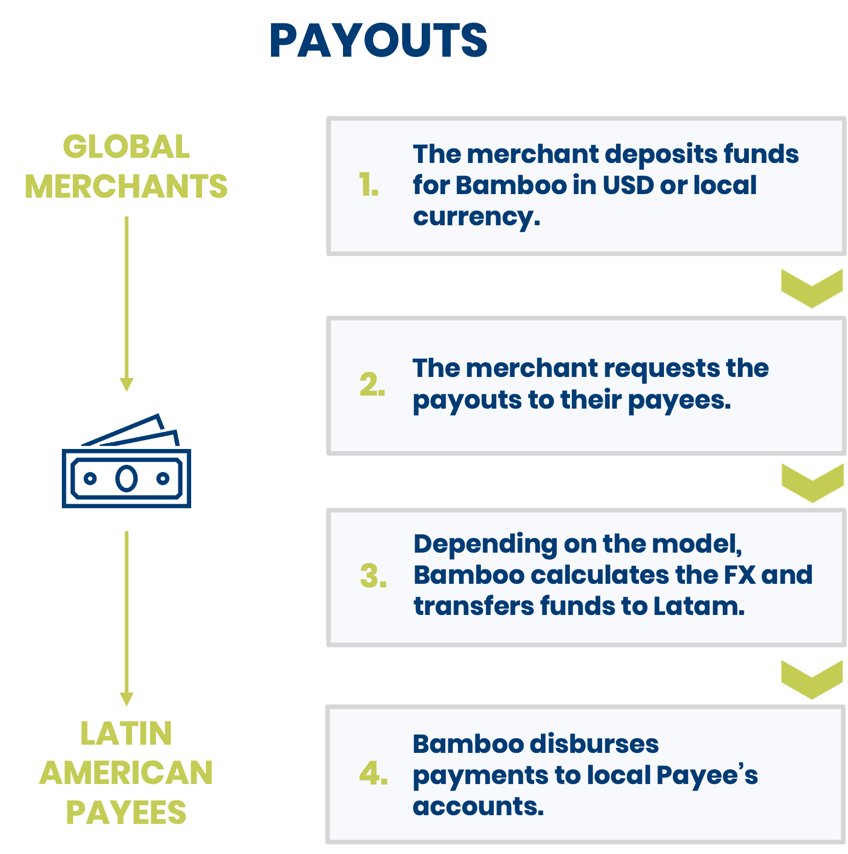 Using Bamboo Payouts, you can efficiently disburse the funds settled in your account to local beneficiary accounts. The following image briefly explains the process.