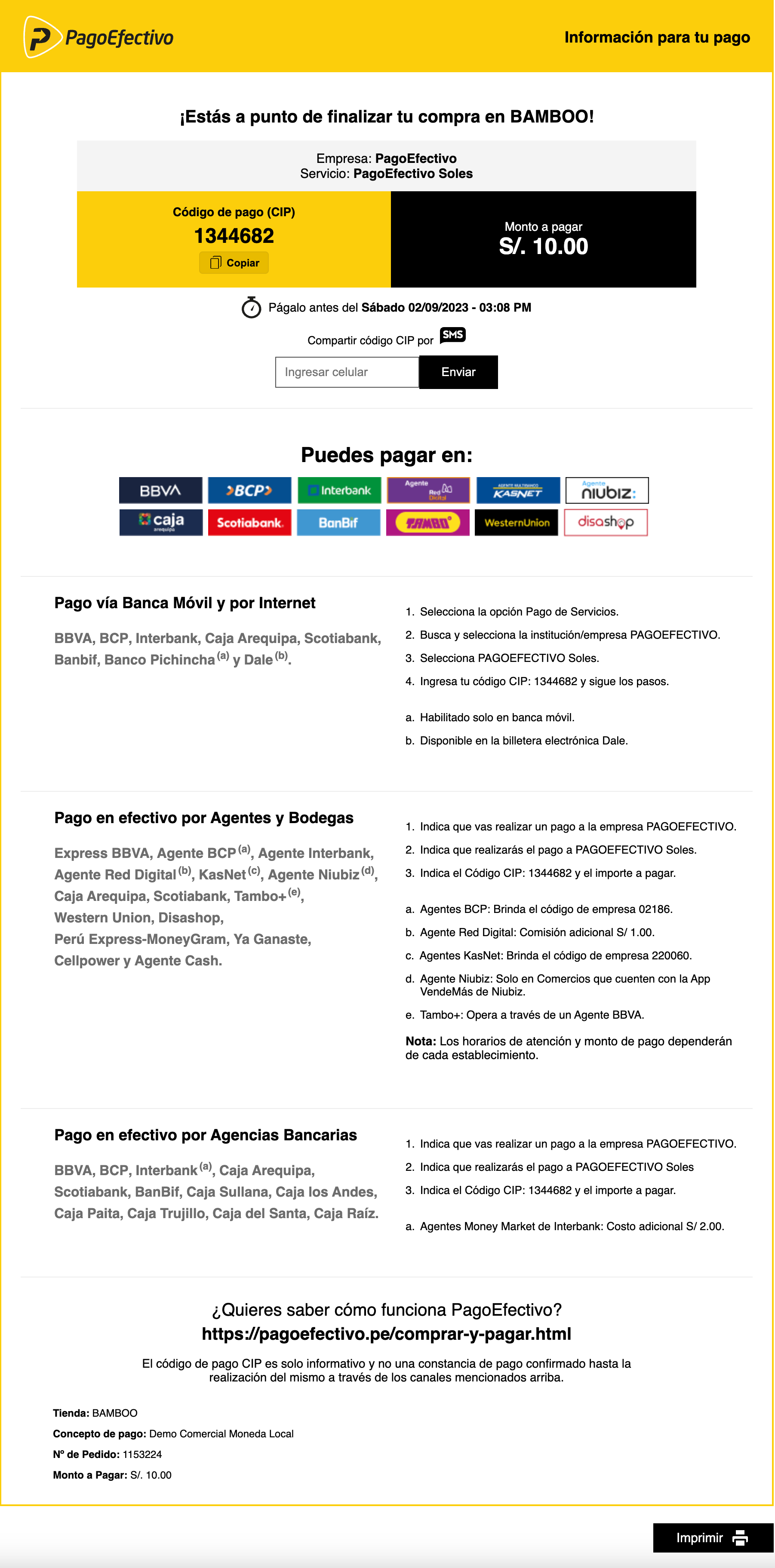 PagoEfectivo allows payers to complete their purchases in cash or through their online banking app using a unique payment code (CIP). When this method is selected, Bamboo generates the CIP and a payment URL where the payer can view the voucher and complete the payment.