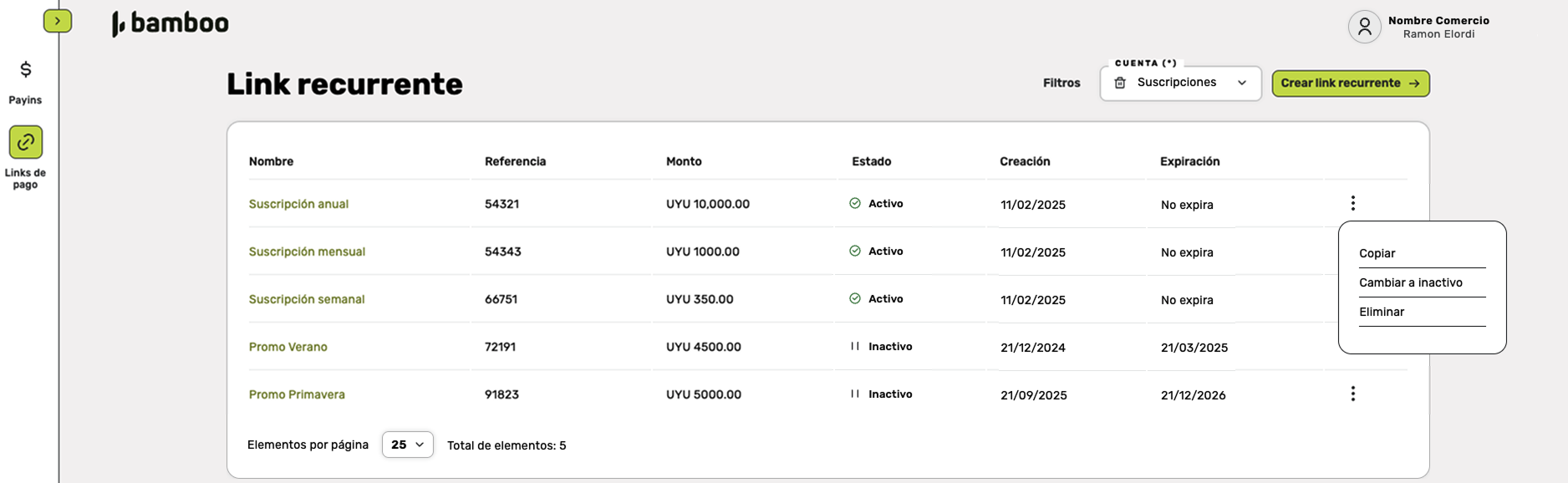 The main view displays a table with all recurring links and their information. The list also includes a context menu that allows you to copy the recurring link to the clipboard, change its status, or delete it.